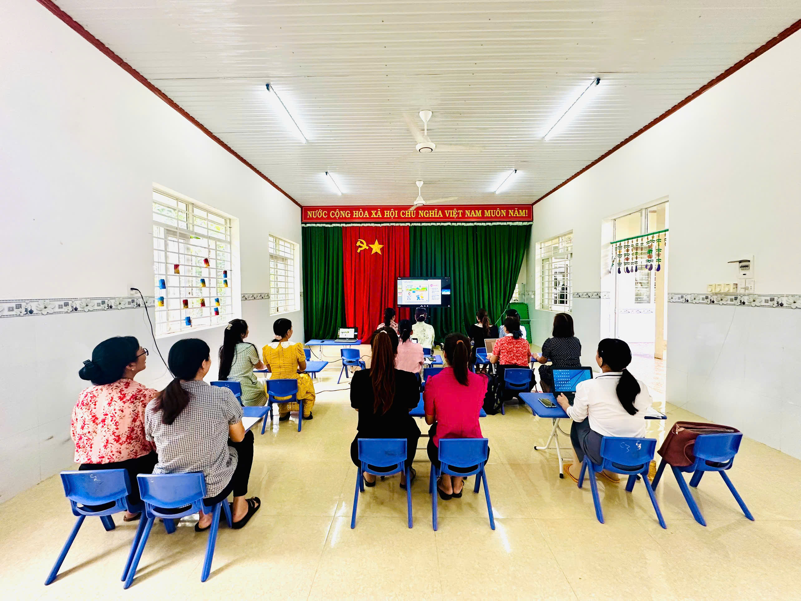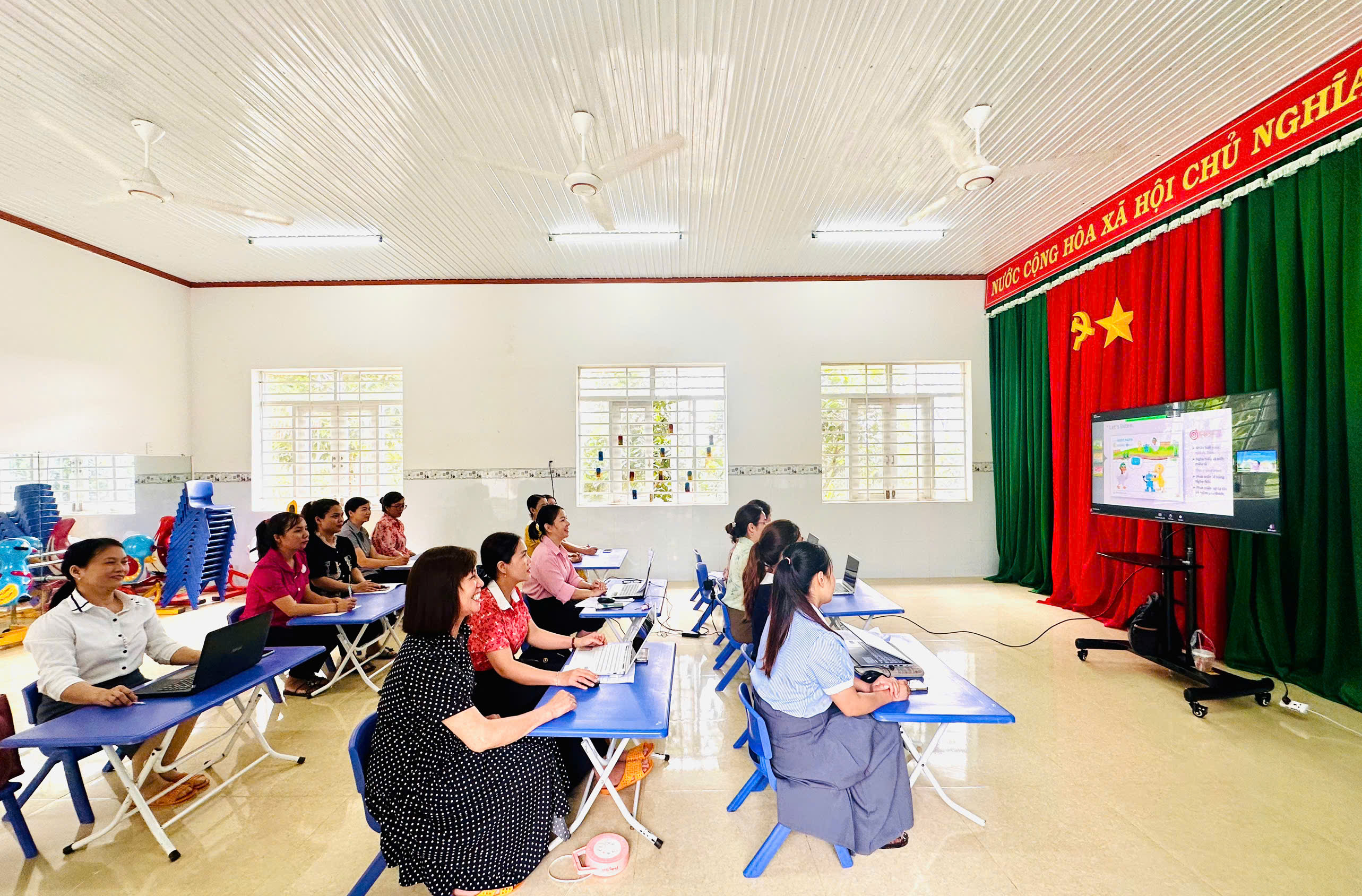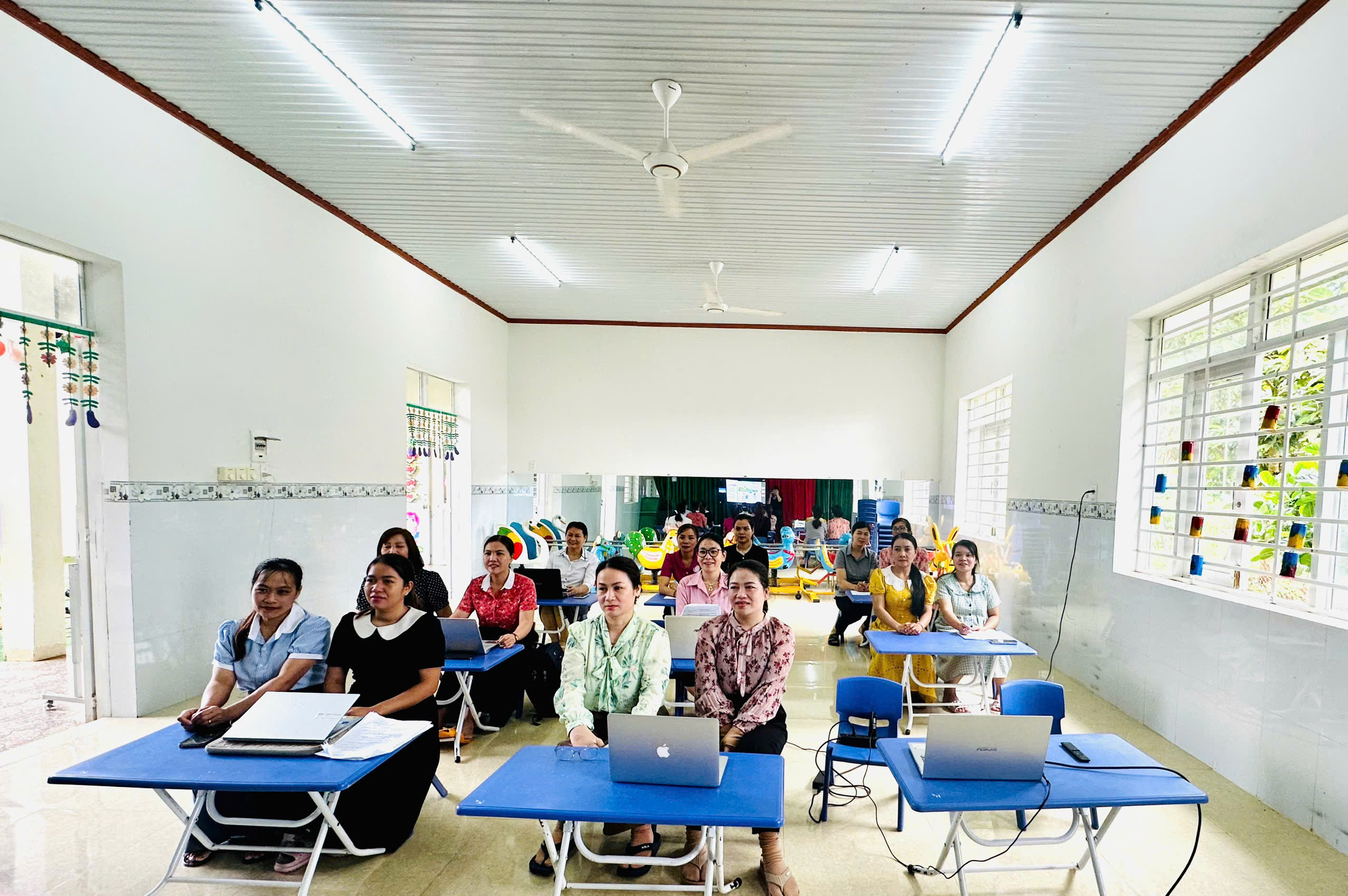 Thực hiện Kế hoạch công tác tháng 10/2025, Phòng Giáo dục Mầm non- Sở Giáo dục và Đào tạo tỉnh Lâm Đòng tổ chức buổi tập huấn online với nội dung sử dụng Bộ tài liệu Làm quen tiếng Anh (dành cho lứa tuổi mẫu giáo). Sáng ngày 10/10/2025, tại trường MN Hoa Mai, tập thể CB và giáo viên các lớp có trẻ được làm quen tiếng Anh đã cùng tham gia buổi tập huấn với nội dung: Giới thiệu và tập huấn chuyên môn Bộ tài liệu Làm quen tiếng Anh (dành cho lứa tuổi mẫu giáo) do Công ty Cổ phần Đầu tư và Phát triển Giáo dục Phương Nam biên soạn, phát hành.